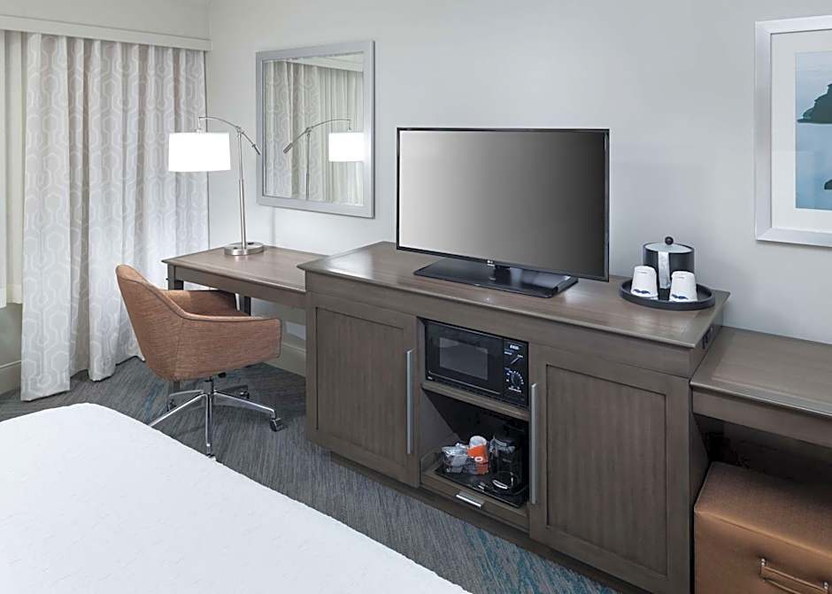 This guestroom includes a 32-inch flat-screen TV, a microwave, and a small refrigerator.